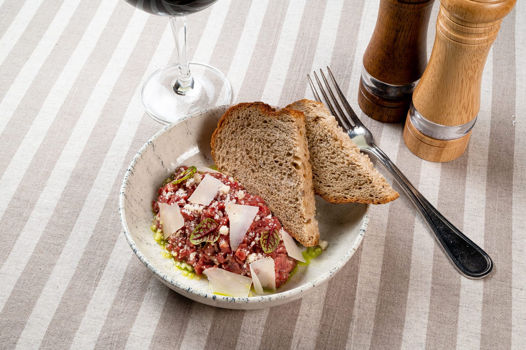 - Тар тар из говядины с лепестками пармезана — насыщенность и глубина, идеальны для красного вина.