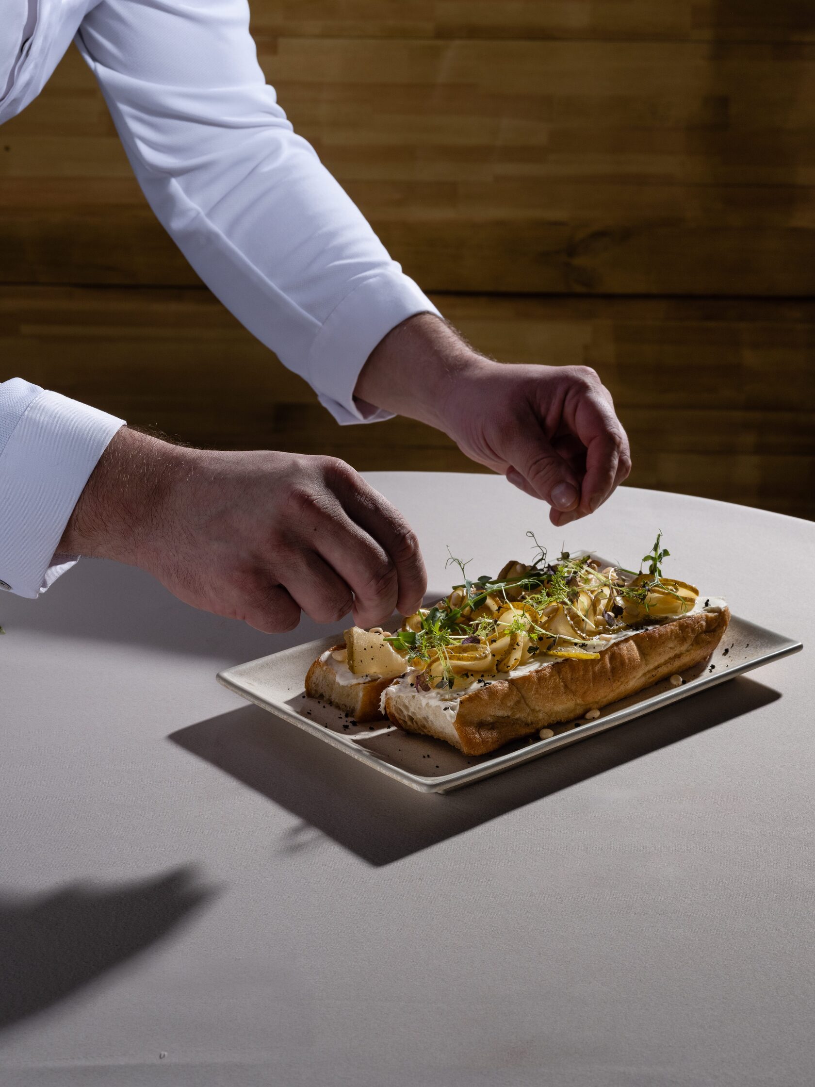 - Брускетта с карамелизированной грушей, крем чизом и кедровыми орехами: сладкое, сливочное и ореховое — сочетание, которое хочется смаковать. Подходит к розе и игристым, когда вечер обещает быть долгим.